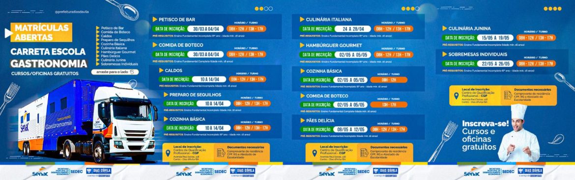 Município de Dias d’Ávila recebe a Carreta Escola de Gastronomia. Fruto de uma parceria da Prefeitura Municipal, por meio da Secretaria de Desenvolvimento Econômico (SEDEC), com o Serviço Nacional de Aprendizagem Comercial (SENAC), a carreta ficará estacionada no Centro de Qualificação Profissional (CQP) por um período de 6 meses, e capacitará cerca de 720 munícipes, com idades a partir de 16 anos, com os mais diversos cursos da área.