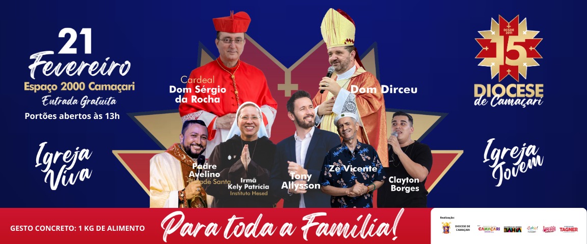 A programação contará com momentos de espiritualidade, apresentações musicais, shows e a Santa Missa.A Diocese de Camaçari vai celebrar, no dia 21 de fevereiro, seus 15 anos de criação, com uma grande programação. O evento gratuito, será realizado das 13h às 22h, na Arena Jorge Abelha (Espaço Camaçari 2000), em Camaçari, e deve reunir um público de 20 mil pessoas de toda região.Com o tema “Uma Igreja viva, uma Igreja jovem”, a celebração marca uma década e meia de caminhada pastoral, evangelização e serviço ao povo de Deus. A programação contará com momentos de espiritualidade, apresentações musicais, shows e a Santa Missa.Entre as presenças confirmadas estão o Cardeal Dom Sérgio da Rocha, Arcebispo de Salvador da Bahia e Primaz do Brasil; Dom Dirceu de Oliveira, bispo da Diocese de Camaçari, o bispo emérito, Dom João Carlos Petrini, além de bispos confirmados das dioceses de Cruz das Almas e Alagoinhas. Como atração musical estão confirmados Zé Vicente, Cleiton Borges e grandes nomes da música católica, como, Tony Allysson e Irmã Kelly Patrícia, do Instituto Hesed.Os portões da arena estarão abertos a partir das 13h. O evento é gratuito, e os participantes são convidados a contribuir com 1kg de alimento não perecível, que será destinado às ações sociais.O espaço está sendo cuidadosamente preparado para acolher o público com conforto, segurança e acessibilidade, contando com área adaptada para pessoas com deficiência, pontos de hidratação, praça de alimentação, banheiros e cadeiras. A programação inclui ainda tendas temáticas, que integram espiritualidade, memória e ação social.Na Tenda da Caridade, o público poderá conhecer os projetos sociais desenvolvidos pela Diocese. A Tenda da Adoração oferecerá um espaço reservado para momentos de Adoração Eucarística e intercessão. Já a Tenda da Memória abrigará um memorial fotográfico com registros marcantes da caminhada das paróquias, das ações pastorais e uma linha do tempo com momentos significativos da história da Diocese de Camaçari.A Diocese de Camaçari é composta pelos municípios de Camaçari, Dias d’Ávila, Simões Filho, Candeias, Madre de Deus, São Francisco do Conde, São Sebastião do Passé e Terra Nova, reunindo fiéis das 26 paróquias distribuídas nessas cidades.O evento é realizado pela Diocese de Camaçari e conta com o apoio institucional do Governo do Estado da Bahia, da Secretaria de Turismo do Estado (Setur) e da Prefeitura Municipal de Camaçari.